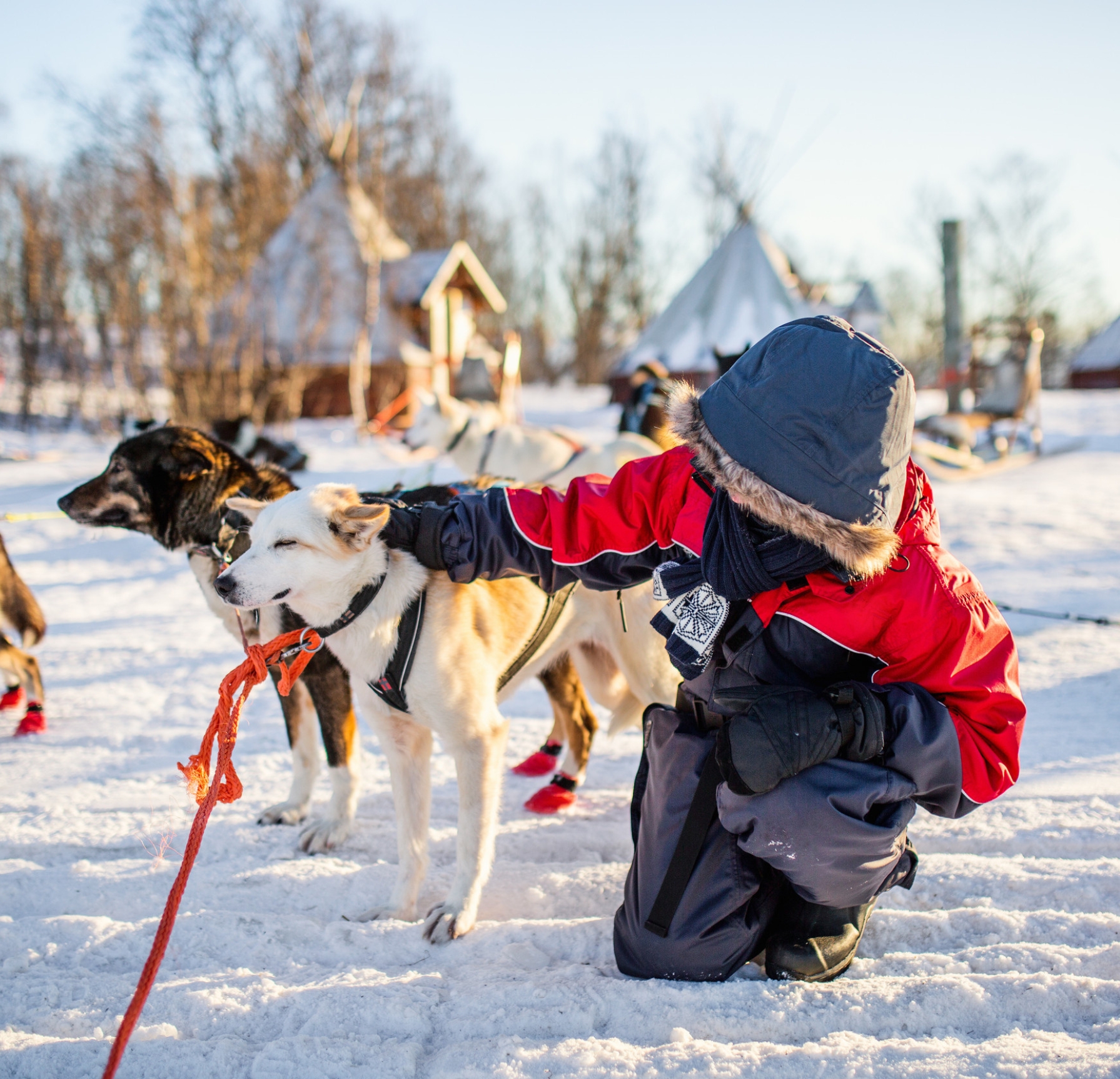- Los niños de 4 a 14 años van sentados en un trineo detrás de la motonieve del guía. En el trineo con huskies, los niños pueden viajar junto con sus padres.